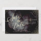 Glamour gold hand lettering calligraphy design and gold dots confetti on dark black sky night watercolor background, shimmer faux metallic gold glitter effect, modern, chic, elegant and classy, perfect for vintage wedding or winter wedding in evening. Custom your own save the date card for your wedding invitation set.
