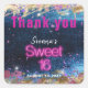 Introducing an exquisite, personalized Thank You sticker design for a modern Sweet 16 birthday celebration. This captivating sticker showcases a mesmerizing blue glittery backdrop embellished with elegant faux gold foil. Vibrant purple and pink paint splatters add a playful touch, while twinkling lights bring a magical ambiance. The centerpiece of this trendy design is the "Sweet 16" text, artfully crafted in a captivating hot pink neon typography. Enhance your celebration with this stunning sticker, a perfect blend of contemporary style and heartfelt gratitude.