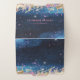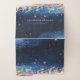 This is a captivating customizable file folder that beautifully captures the transition from a starry night to a golden dawn. The top section is adorned with an abstract pattern of gold, pink, and purple hues, reminiscent of a sunrise or the ethereal touch of fairy dust. This vibrant splash of colors gradually gives way to a deep blue expanse speckled with stars and lighter blue splashes, evoking the tranquil beauty of a night sky. The folder is personalized with the text “CATHERINE BROOKS event planner” in elegant light pink lettering, standing out against the dark backdrop. This artistic print makes the folder not just a functional item, but also a piece of art that can add a touch of creativity and personal style to any workspace.