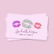 Elegant makeup artist business card design featuring faux rose gold glitter lips, purple background and elegant calligraphy font.
