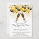 A modern and festive New Year's eve party invitation with gold and black balloons, champagne glasses, and gold glitter confetti, and a modern script type.