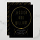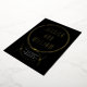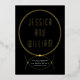 An exquisite wedding invitation with intricate gold foil accents and a contemporary design of a gold frame. Within the frame, the invitation showcases the names of the couple against a black backdrop. Adjacent to the frame, there are two overlapping semi-circles that resemble a wire choker, adding a touch of allure. On the reverse side, a sophisticated element is introduced as the couple's names are elegantly displayed diagonally in gold on a black background.