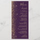 The left-hand edge of this elegant modern wedding menu features a gold faux glitter design. The customizable text combines gold-colored handwriting, copperplate and italic fonts on a dark purple background. The reverse side features a matching purple and gold glitter design.