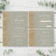 The left-hand edge of this elegant modern wedding menu features a gold faux glitter design. The customizable text combines ivory handwriting, copperplate and italic fonts on a sage green background. The reverse side features a matching sage green and gold glitter design.