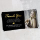 Express your heartfelt gratitude uniquely with our modern graduation thank you cards. Each card is thoughtfully crafted to feature the graduate's photograph, name, school, and class year, further personalized with a gold script 'Thank You' and a hint of gold glitter. A perfect keepsake to capture your graduation memories while sending your thanks.