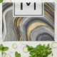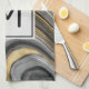 A kitchen towel with an abstract design with an agate geode mineral pattern. Gold, gray, white, and black swirl together forming elegant waves of color.