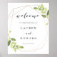 Custom-designed wedding welcome sign featuring modern geometric gold frame with watercolor greenery design.