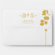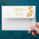 This is a graceful wedding envelope that features a gold line with a branch with leaves and a dot on the right positioned against a white background. Your initials and dots are on the flap. It is part of our “Jewelry inspired gold foil wedding invitation collection” wedding suite.