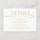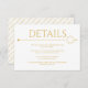 This beautiful wedding enclosure card has a sophisticated design with a gold line of concentric circles and a leaf on the right side and a dot on the left side on a white background. For an extra touch of elegance, the couple's names are featured in gold diagonal pattern on the backside of the card. It is possible to customize the card by adjusting the size of the text to fit the desired amount of space.