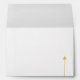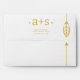 An elegant white wedding envelope that features a gold line with leaf and arrow positioned against a dark background on the right of it. Your initials and dots are on the flap. It is part of our “Jewelry inspired gold foil wedding invitation collection” wedding suite.