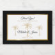 Thank your guests for celebrating with you on your special day with these modern black, white and gold mini sparkling wine labels featuring the words "Thank you for celebrating with us" and an artistic golden palm tree and elegant gold foil frame over a white background. Easily personalize them with the provided templates for the bride and groom's names and wedding date. If you need help or matching items, please contact me.