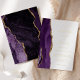 The left-hand edge of this elegant modern wedding invitation features a purple watercolor agate border trimmed with faux gold glitter. The customizable text combines handwriting, copperplate and italic fonts in real gold foil on a white background. The reverse side features a matching purple and gold agate design.