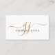 This modern business card features an elegant gold script monogram of your initials, perfectly balanced with your name in a clean black serif font. A sophisticated and eye-catching design, it is ideal for any professional seeking a premium and stylish brand identity. The reverseside ogf the card includes social media icons and handles to help clients connect with you online. All text is fully customizable.