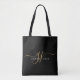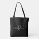 An elegant modern minimalist style monogrammed tote bag, with a sans serif name and elegant gold swash script initials on black.