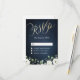 Modern faux gold RSVP calligraphy and watercolor white floral eucalyptus greenery on dark navy blue background, elegant and stylish, great for greenery rustic wedding, botanical garden wedding, boho floral wedding in summer and winter.