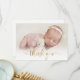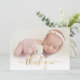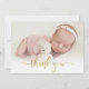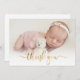 Simple Modern Elegant Calligraphy Gold Script Photo Newborn Baby Thank You Birth Announcement Card. Features a beautiful "thank you" text in a handwritten calligraphy swash tail font script in FAUX gold foil. Pre-made personal message at the back side. Great for baby girl or baby boy. Easy to personalize with your baby photo and details.