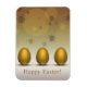 An abstract and modern Easter illustration featuring 3 golden Easter eggs on a bokeh background with abstract flowers.