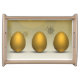 An abstract and modern Easter illustration featuring 3 golden Easter eggs on a bokeh background with abstract flowers.