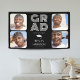 Simple GRAD photo collage graduation banner. Design features 4 square pictures of the grad, decorative lettering, a mortarboard, name, place of study and class year. The black background can be changed to any color of your choice.