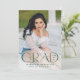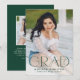 Announce your high school or college graduate's graduation with this modern graduation announcement. The graduation announcement displays "Grad" in trendy dark green lettering with the graduation year displayed inside of the letter 'd'. Personalize the front of the announcement with the graduate's vertical senior photo, name, and school. The announcement reverses to feature an additional photo displayed inside of a white square frame with your message shown below.