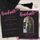 Celebrate Your Daughter’s high school, College or university Graduation with a Beautiful black and hot pink graduate photo arch elegant script Announcement Card. Mark your daughter’s graduation with this Modern hot pink Script Calligraphy Graduation Photo Announcement Card, designed to capture the spirit of the occasion. Featuring elegant pink calligraphy script on a striking black background and an elegant hot pink arch, this card exudes style and charm. The front showcases the word graduate in elegant hot pink script calligraphy complementing your daughter’s name and graduation details in hot pink contemporary typography on a striking black background, while the back highlights additional information in modern hot pink typography.