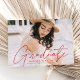 Celebrate the grad with our stylish photo graduation announcement. The graduation announcement displays the graduate's photo with "Graduate" in a red modern calligraphy script overlay. Personalize the front of the modern graduation announcement by adding the graduate's name, school name, and graduation year. The announcement reverses to feature a trendy red and white dotted geometric pattern. The design is perfect for both high school and college graduates.