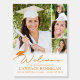 Celebrate your graduate and identify the party location and welcome guests with this welcome sign in orange and white featuring four photos and modern script typography. The design features a modern handwritten script typography title WELCOME accented with a orange graduation cap and personalized with your custom text, graduate's name, school and class year. Make text and graphic color changes in EDIT. OPTIONS: The sample is shown in a 18x24" size; other sizes are available (go to CHOOSE YOUR SIZE section for even borders by changing the height and width proportionally AFTER clicking the UNLOCK icon). You can also transfer the design to a poster, banner, tapestry backdrop or other products or have the designer convert it to a DIGITAL DOWNLOAD file for local printing BEFORE personalizing. ASSISTANCE: For help with design modification or personalization, color change, resizing or transferring the design to another product or converting to a Download file, contact the designer BEFORE ORDERING via the Zazzle Chat MESSAGE tab below or email makeitaboutyoustore@gmail.com.