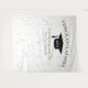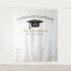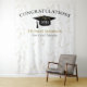 Modern graduation celebration backdrop for photo opportunities! Glitter at top and bottom, gold streamers from top edge, graduation cap and lettering in black, name template in gold. Class of in gold glitter script lettering with template of year in white. Add year, name and school name.