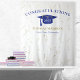 Modern graduation celebration backdrop for photo opportunities! Glitter at top and bottom, gold streamers from top edge, graduation cap and lettering in blue, name template in gold. Class of in gold glitter script lettering with template of year in white. Add year, name and school name.