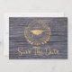 This is modern simple and elegant classic gold with gray toned wood grain Save the Date announcement card. Modern style text. Add your own message on the back of the cards giving details to your family and friends to save the date for a graduation ceremony, event, party or other occasion. Logo style design includes laurel leaves, stars and a graduation cap.