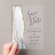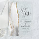 The left-hand edge of this elegant modern wedding save the date card features a gray and white watercolor agate border trimmed with faux gold glitter. The customizable text combines charcoal gray handwriting, copperplate and italic fonts on a clear background.