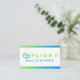 A modern business card featuring a green and blue gradient background.
