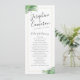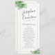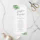 Realistic looking green palm tree leaves surround a gold-colored geometric border on a simply modern and elegant tropical beach destination wedding program with minimalist flair.