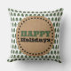 This modern and simple throw pillow features green pine trees on a white background with Happy Holidays text in a kraft paper polka dot circle. Click the personalize button to customize the text in this design. These items coordinate with our other items in the collection.