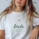 Modern Green Coquette Custom Bride's Name Wedding/Bachelorette T-shirt. A minimalistic and modern, olive green and white, custom bachelorette and/or wedding t-shirt, designed with "bride" in script lettering. Personalize with the bride's name, and bachelorette weekend or wedding location below.