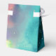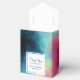 Wedding favor box with a cool and stylish abstract design. Watercolors mix and mingle to create the illusion of a space image. Green with swirls of purple, yellow and light red blend together with a smattering of white dots and stars. A cool trippy creation. A white square layered over top with your text inside.