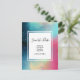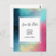 Save the date postcard with a cool and stylish abstract design. Watercolors mix and mingle to create the illusion of a space image. Green with swirls of purple, yellow and light red blend together with a smattering of white dots and stars. An elegant artistic creation.