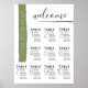 Simple, modern wedding seating chart with a green brush stroke down the left side and welcome at the top. Easy to read and customize. Room to add at least two more guests to each table. Very economical way to show your guests to the right seat. Could be mounted on foam core board and placed on an easel. This poster matches other pieces in this wedding suite.