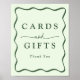 Add a stylish touch to your wedding, bridal shower, baby shower, graduation party, or other special event with this Modern Green Wavy Frame cards and gifts sign. The design features "Cards and Gifts" in bold green lettering surrounded by a green wavy border contrasting with a light green background. Personalize the retro cards and gifts sign with your custom text below. Choose between professional printing or instant download options, providing flexibility for your convenience.