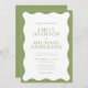 This wedding invitation features a clean white center framed by a soft green wavy border for a fresh, elegant garden-inspired look. The flowing wavy frame adds an organic, modern feel while keeping the layout minimal and refined. The green and white color palette creates a calm, natural style that works beautifully for outdoor and garden weddings.