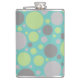 Modern pattern features large and small bubbles of kiwi green and shades of gray on aqua / turquoise background