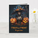 The front of this Halloween greeting card features a modern witch with a big hat and glowing eyes. Beside her are two grinning Jack o 'Lanterns. The inside of the card has text fields for your personal message, plus dead trees, a black raven, and a flying bat. All the text may be easily customized, so make it say whatever you'd like, or leave it as is...the choice is yours! Appropriate for adults.