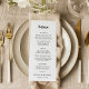 This wedding menu card makes a statement with its modern, bold script. The black and white color scheme creates a striking and sophisticated look, while the clear layout ensures your guests can easily enjoy the curated courses planned for your special day.
