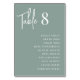 Simple and chic table number cards in Eucalyptus Green and white make an elegant statement at your wedding or event. Design features "table [number]" in handwritten script lettering, with individual guest names below in timeless serif typography. Design repeats on both sides.