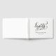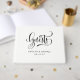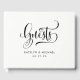 A clean, elegant wedding guest book featuring "Guests" in beautiful flowing black handwritten script on a crisp white cover. The couple's names and date in refined typography below create a sophisticated, understated design. The spine is personalized with the couple's names and date. Customize the couple's names and wedding date.