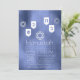 Modern Hanukkah party invitation with white hanging dreidels and Star of Davids on a blue bokeh background.