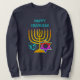 Modern Hanukkah HAPPY CHANUKAH unisex sweatshirt, with CUSTOMIZABLE TEXT, designed with faux gold menorah, colorful Star of David and silver colored dreidel plus CUSTOMIZABLE GREETING, so you can create your own greeting. Ideal men's or women's sweater for Hanukkah season. Choose from a wide section of Hanukkah clothing and gifts, designed by Berean Designs.
