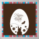 Happy Easter illustration featuring a simple minimalist Easter egg colored with silhouettes of a rabbit, butterfly, flowers and Easter greeting on a chocolate brown background with a striped frame.