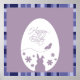 Happy Easter illustration featuring a simple minimalist Easter egg colored with silhouettes of a rabbit, butterfly, flowers and Easter greeting on a pink purple background with a striped frame.