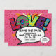 Featuring love hearts confetti, a fun, cool and trendy comic book inspired save the date card that puts the wham, zap, pow into your wedding date announcement. The reverse features matching love hearts confetti on a pink comic book polka dot background. Designed by Thisisnotme©